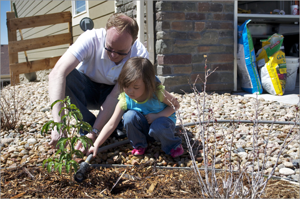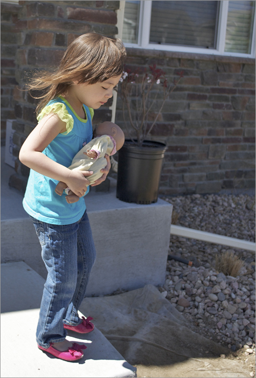 Not sure why Kylie grabbed for her toy baby but after planting the peony, she pretty much sat around with the baby while husband and I put in the plum bush. Husband did all the hard work.