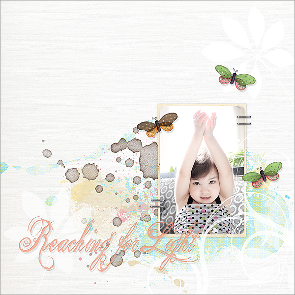 Credits: for “When You Were 2,” I used the Tranquility kit by Roseytoes Designs. The fonts (Quilted Butterfly and Vaguelly Repulsive) are from dafont.com. For “Reaching for Light,” I used papers and elements from DeCrow Designs (Vanilla Cream, Amiable, and Summer’s Last Kiss) and Julie Bullock (butterflies and staples from Walk Softly). The font used was The King and Queen Font from dafont.com ♥