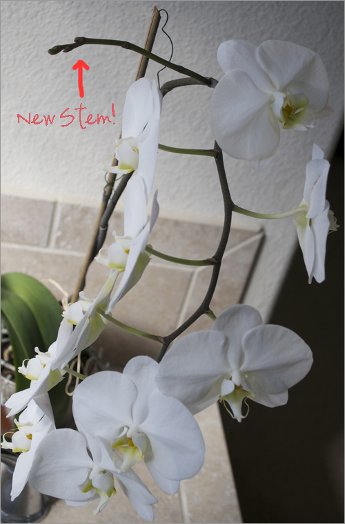 The white one is still going strong! I had no idea that a new stem had grown until I glanced at it earlier this morning while getting out of the shower.