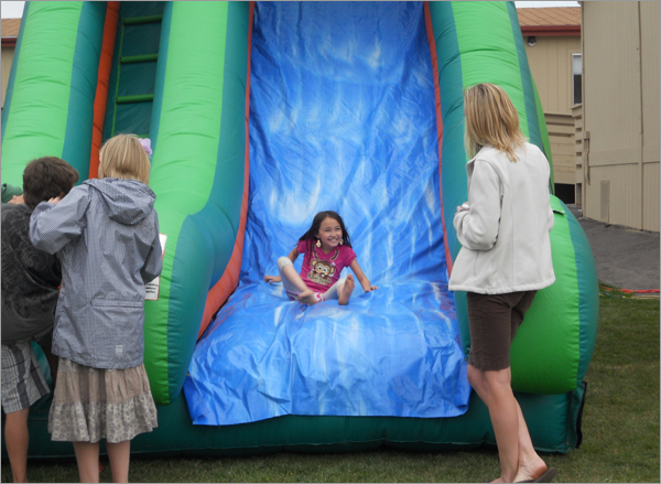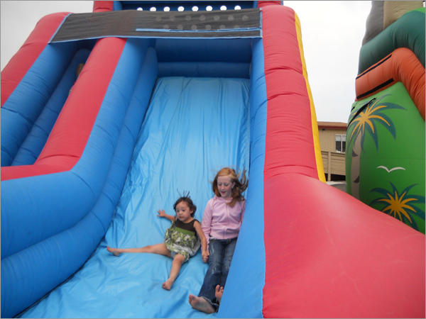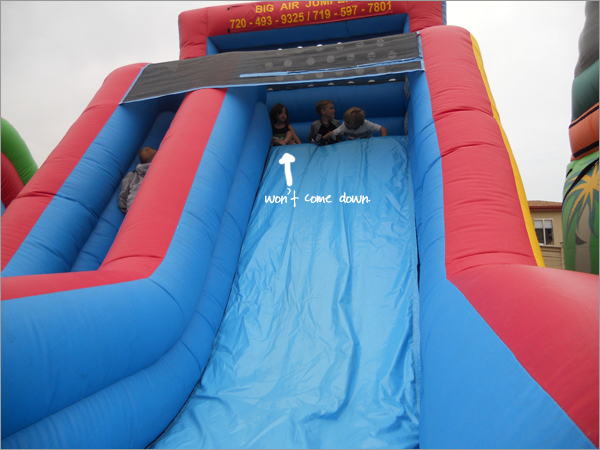 Then, she finally went down with the aid of one of the middle school helpers. She was so scared but the funny thing is, she went on two more slides afterward and kept wanting to go more. She also clogged up the other slides and also had the helpers go down with her each time.