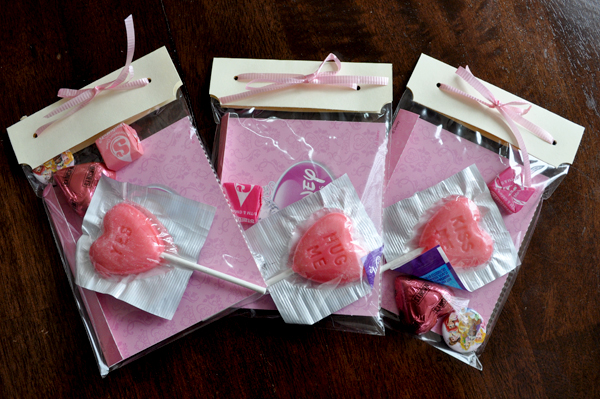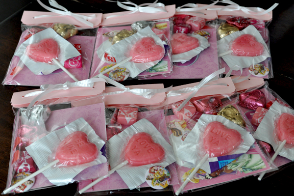 Kida didn’t want hers to be all fancy so she used my jewelry zip-top bags. She was actually pretty upset at me for wanting to create these bags filled with goodies (and hand-made cards) instead of the usual store bought Valentine cards so we compromised.