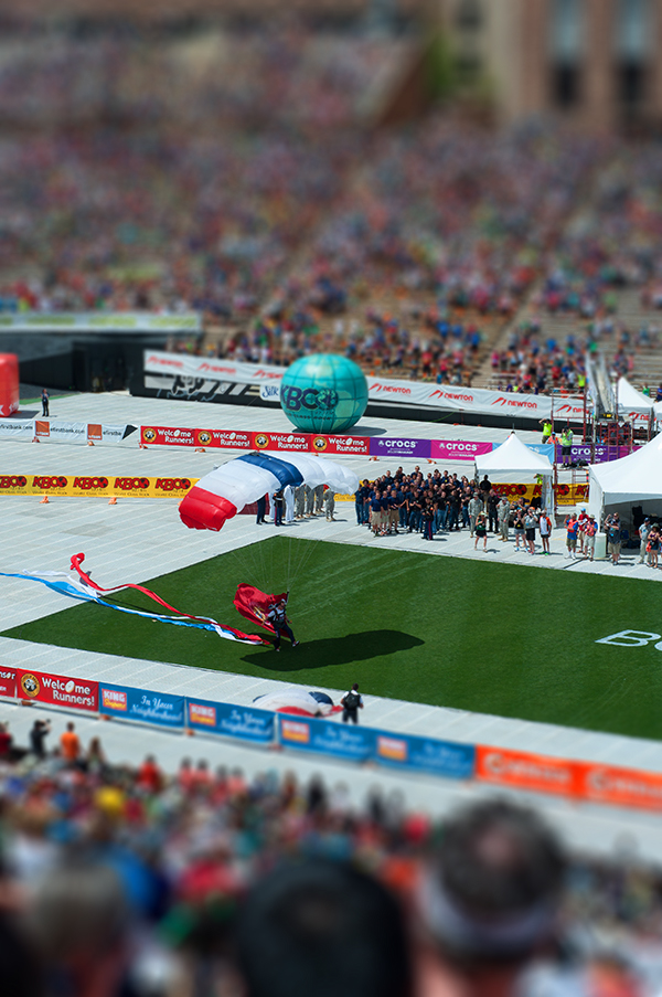 After the last race ended, the memorial tribute began. About seven military skydivers came flying down minutes after each other and landed in the middle of the stadium.