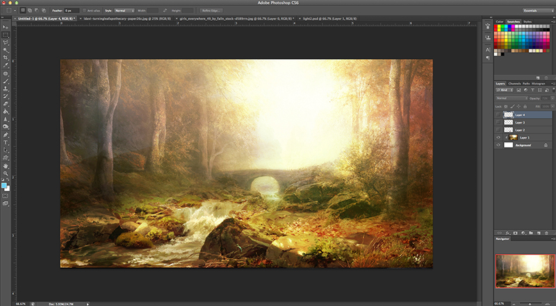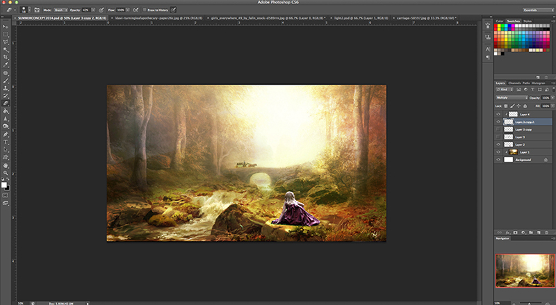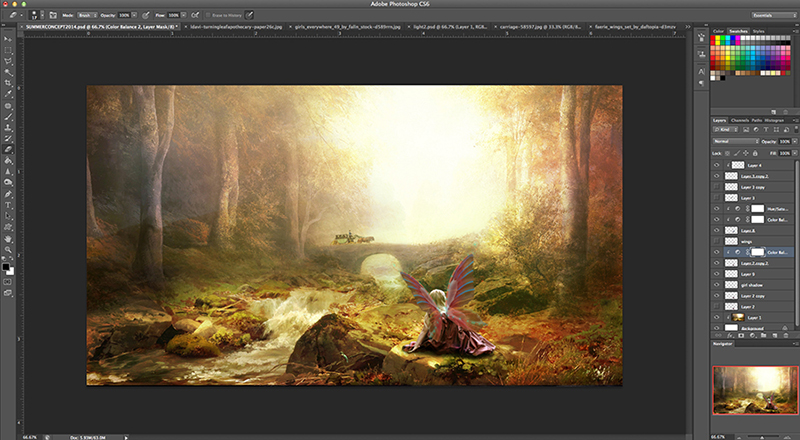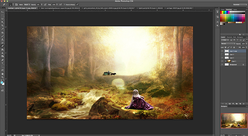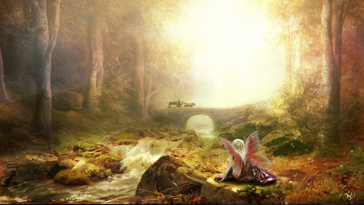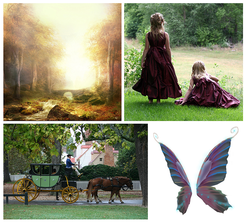 I started out with these stock images. Clockwise from top left: Painted scenery paper by Lorie Davison (purchased), free stock photos of girls’ back by Girls Everywhere 49 at Deviantart, free fairy wings by daftopia at Deviantart, and free stock photo of carriage at Pixabay.