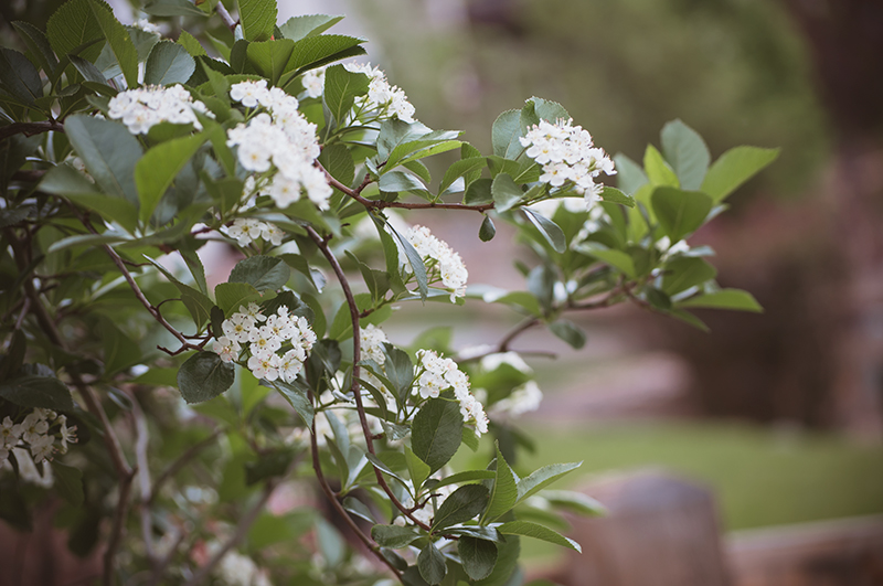 One of the hawthorns in the backyard recently bloomed.  The flowers are tiny and pretty but they stink.