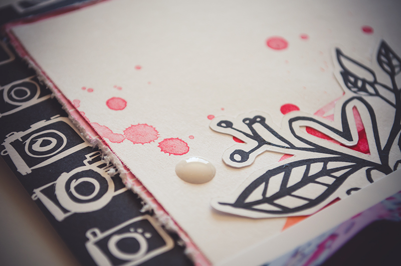 I finally was able to put my Tim Holtz paper distresser to good use as you can see in the last photo where I took a close-up. I also learned how to create a sticker look with the Silhouette Portrait using the Offset. Wilna provides a very good tutorial in her class but she also has the tutorial on her blog. It took a few tries and frustrations to finally get it to work correctly. The whimsical leaves die cuts were from Wilna, the dots were from a FB swap, the acrylic paints are Reeves, and the paper with the white cameras and the paper I’ve distressed are by American Crafts.