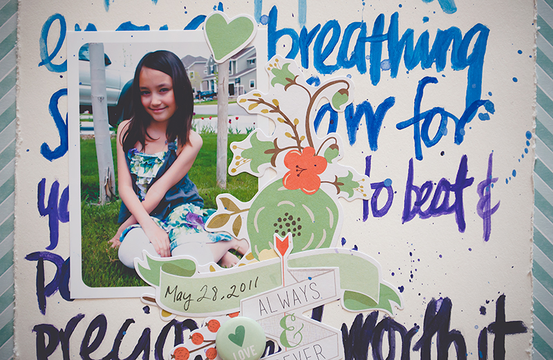 Writing with paint was a challenge. I used Wilna Furstenberg’s premade script and painted over it as she did but it’s not as easy as she made it seem. I enjoyed it though and hope to continue working on my text painting. Used Amy Tangerine patterned paper and ephemera pieces by Teresa Collins. Love badge by Studio Calico. Acrylic paint by Reeves.
