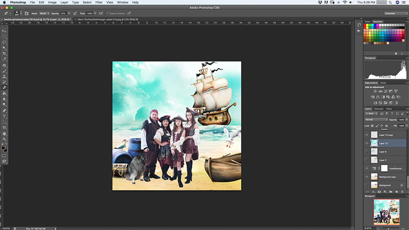 The kids don’t trick-or-treat anymore. My oldest just started a part-time job so she’s working today. It’s going to be busy so I hope she handles it well. My youngest is trying to finish all her homework so she could help hand out candy. This year, the family decided to all dress up as pirates. My oldest can’t dress up so it’s just going to be the three of us. However, we took photos a week ago and I’ve started to create a concept piece using a couple of digital scrapbooking kits. Here’s the initial layout, still in the rough stages, trying to figure out background, props, etc.