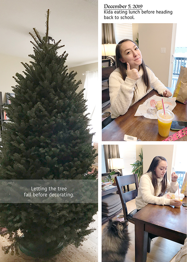 We went and got a Christmas tree at Costco this morning. Before that, daughter came home from school for lunch. We got a quick glance of her before we headed out and she headed back to school.