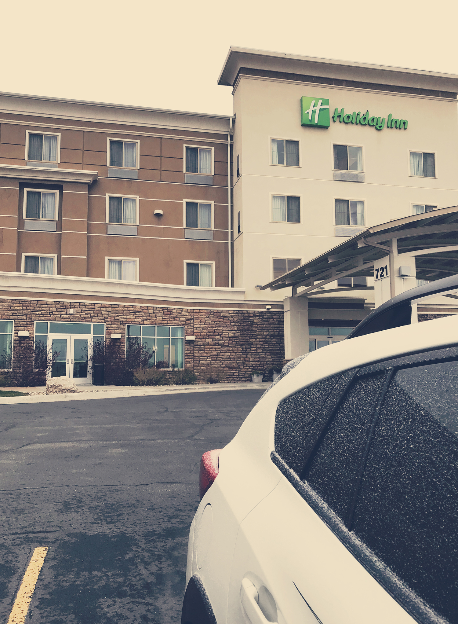 The next morning, we headed home. The car was slightly iced over. It was pretty cold. The roads were wet but not icy, although smaller roads might have been icy. It snowed part way while we were on the road.