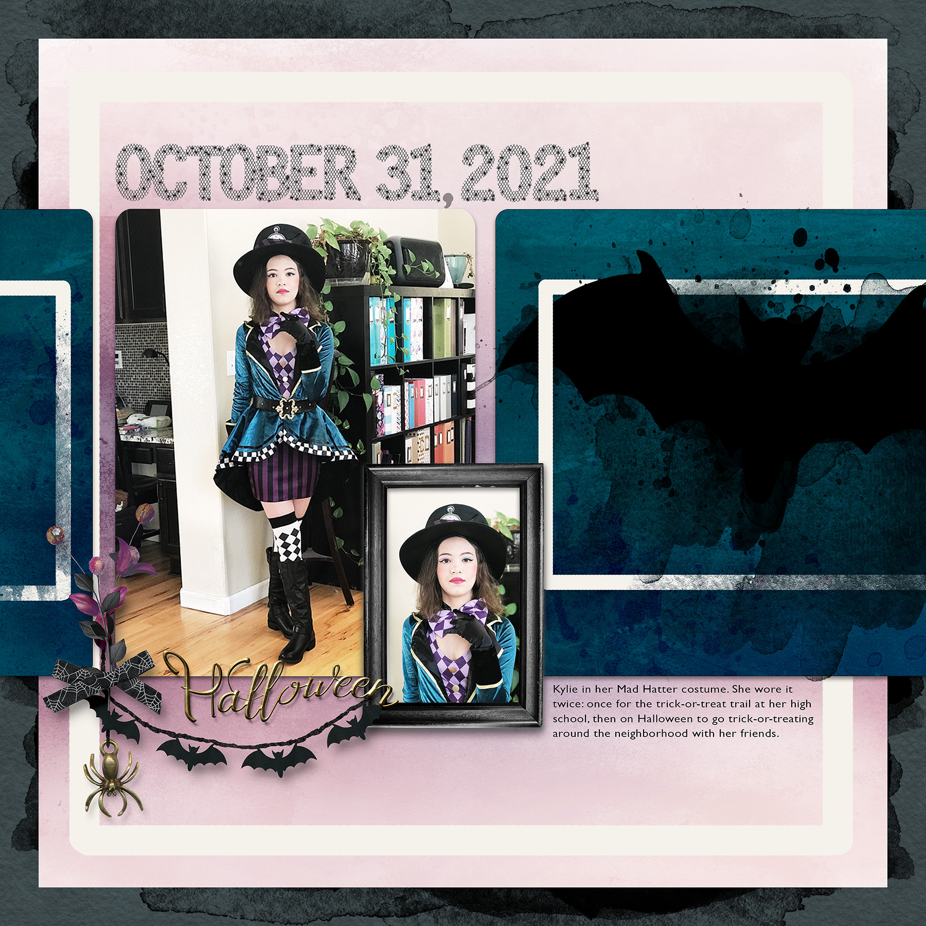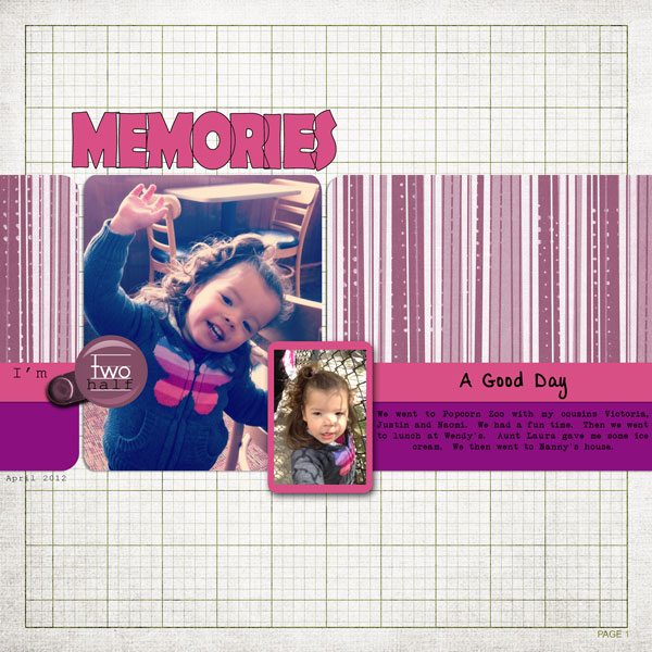 Here’s my first layout. It’s my Oscraps Avatar. This one didn’t count and wasn’t required as part of the challenge. At the end of the challenge, there will be prizes (digital scrapbooking discounts, etc.), but I’m not doing this for the prizes. It’d be nice to win something, but the real fun is in just seeing what others create and creating myself.