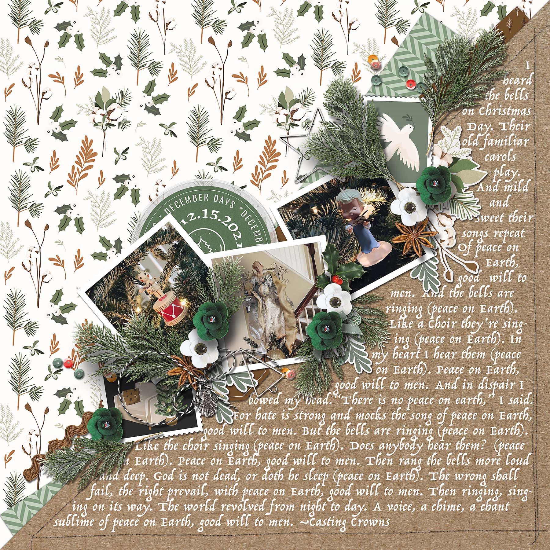 Day 12 (last day!) was to create a layout with Christmas lyrics. It was a tie between “I Heard the Bells on Christmas Day” by Casting Crowns or “Ring Christmas Bells,” by Ray Conniff and the Ray Conniff Singers. I ended up doing the layout with the song by Casting Crowns.