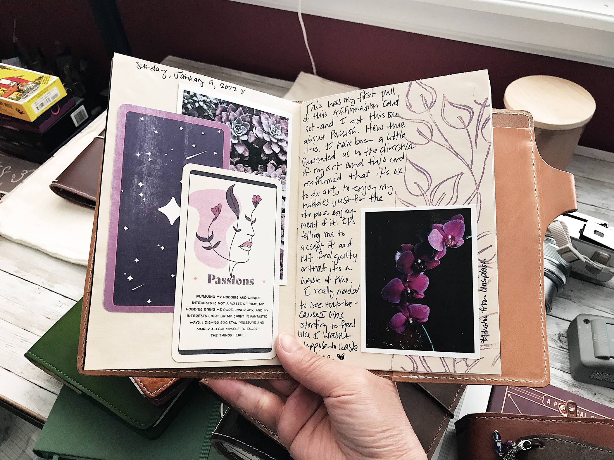 I’m using this one to hold my affirmations. I go through these phases where I question doing art, but I keep returning to art because it relaxes and keeps me creative. It helps me stay focus on my goals (writing/publishing) and my family. It’s strange that way how art has that much control. Here’s my first page of my affirmations. I’m going to pull a card once a month to do a layout and some journaling.