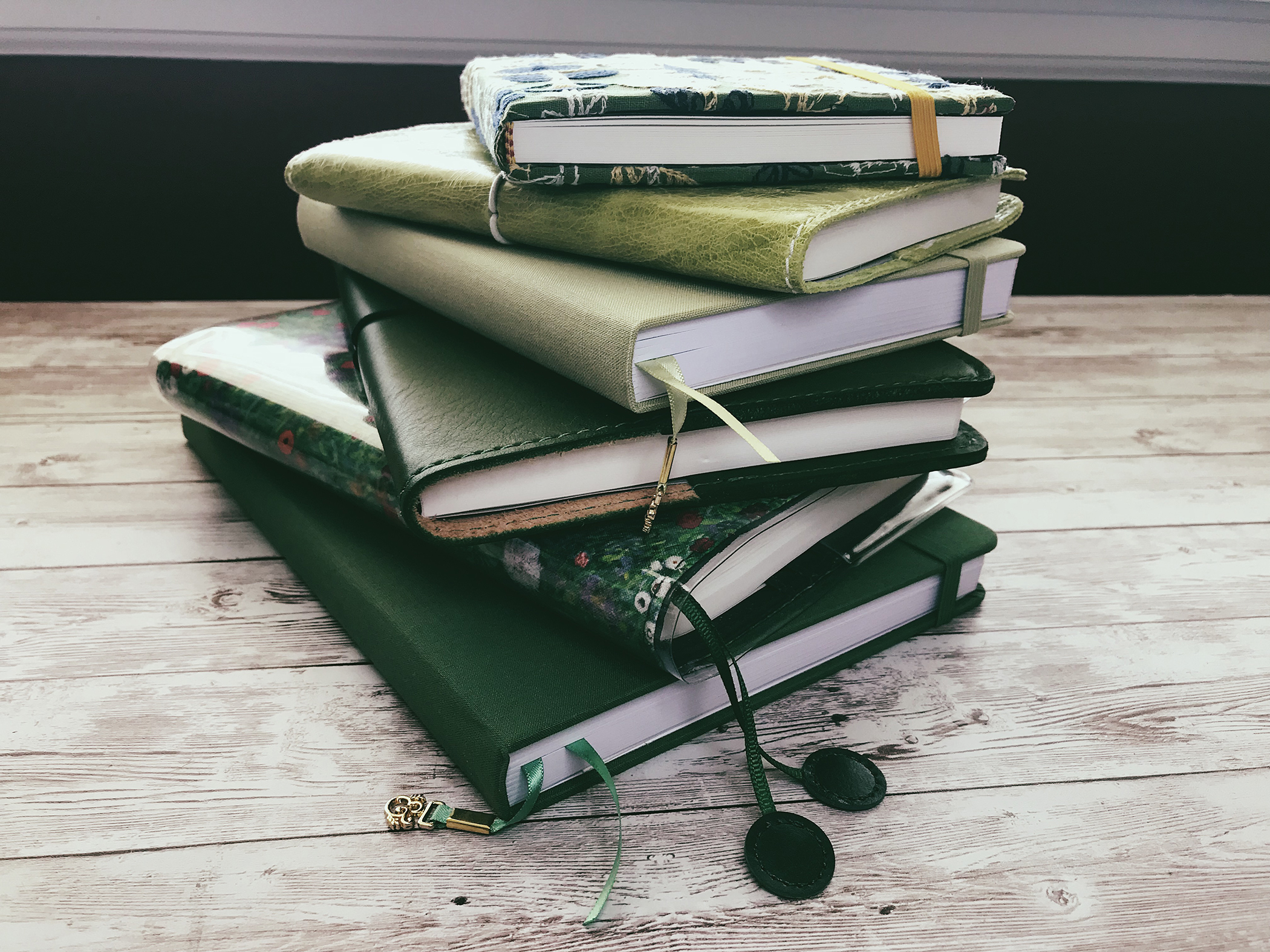 These are all my green notebooks and notebook covers. Clockwise from top left: Archer and Olive Blank A5 Notebook, Archer and Olive Dotted Lines B5 Notebook, Hobonichi A5 Cover from Etsy, Chic Sparrow B6 Glas Express Folio Leather Notebook Cover, 5×5 Watercolor Notebook from Etsy, and Chic Sparrow A5 Artist Gastaldi Leather Notebook.