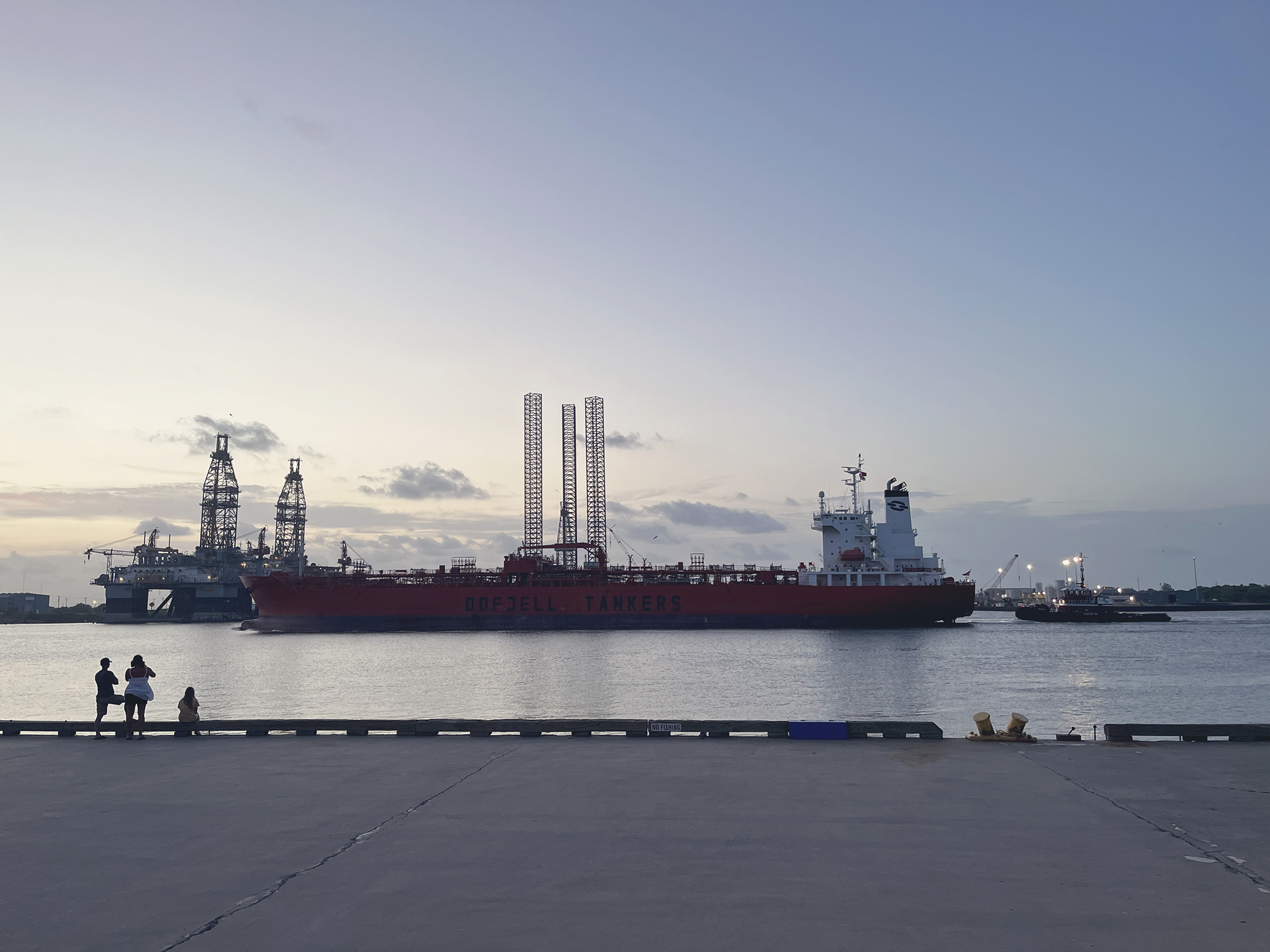 View from our hotel room. We ate lunch at the restaurant in the building behind the bus.Our room in the hotel. Front of the hotel.Walking along the port.The back of the hotel. The view during dinner at a restaurant that was walking distance from the hotel.Watched an oil tanker as it came through and docked.Sunset. This little tug boat looked much bigger in person.Embarking the Royal Caribbean Grandeur of the Seas.At our muster station. We were required to simply go to our station before the ship left the dock. Someone was there to scan our card and then we were done. We watched the rest of the drill information on our phones. It was very simple and quick compared to pre-COVID (on a different cruise line).The main pool area.Main pool area with the movie screen in view. During cruising out at sea, they played “Dune” and “King Richard.”Top deck.Our cabin.Cabin bathroom.Leaving port.Going toward Costa Maya, Mexico. We were out at sea for one full day before arrival. You can see all the oil tankers waiting to come into port. We counted over 20 tankers. Most of them were not in view.