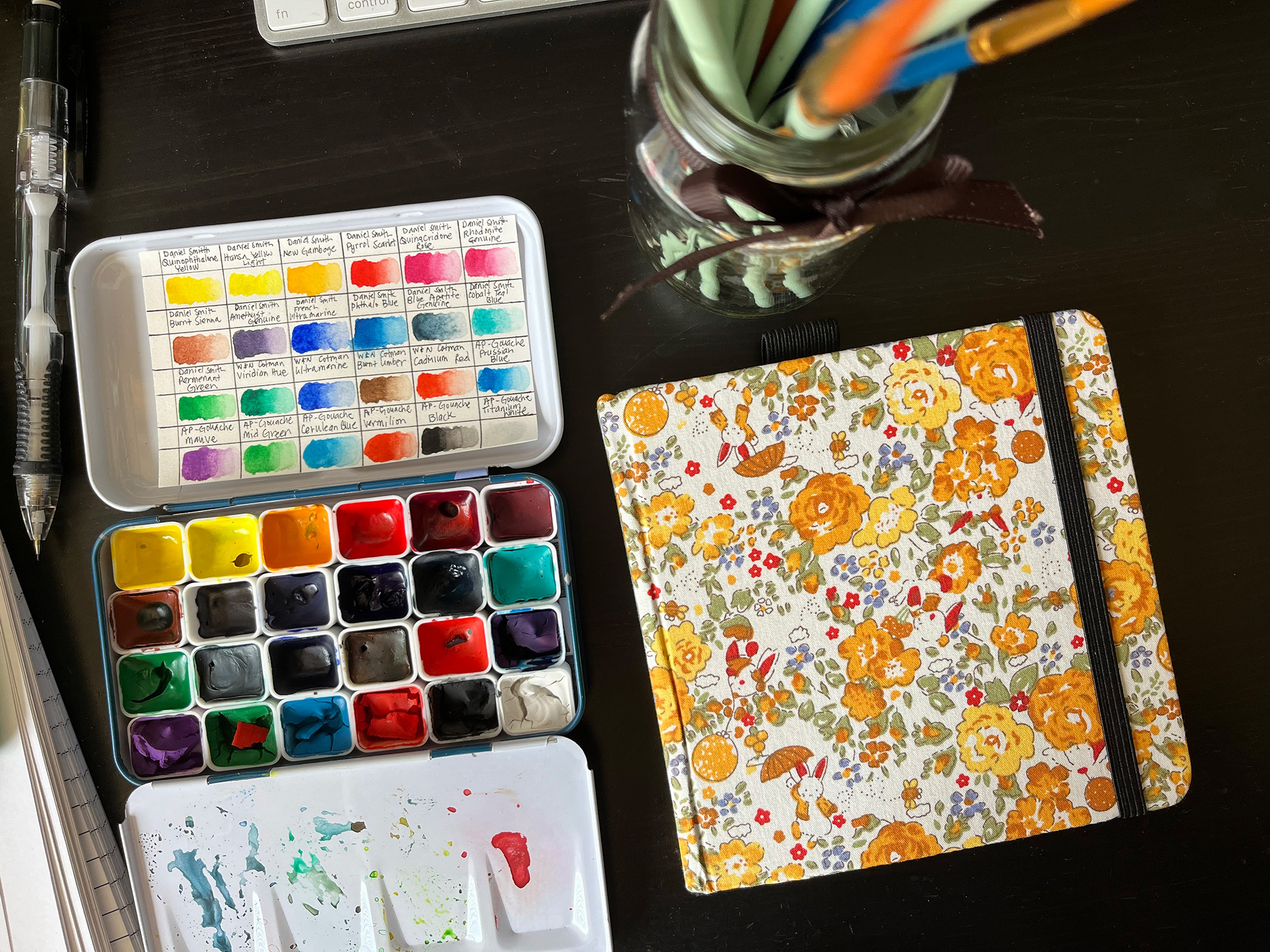I used the paint pan I made last year. I ordered the paint pan from Ali Express and filled it up with mostly Daniel Smith watercolor. There’s also some W&N Cotman and Art Philosophy Guache. I don’t have a photo of the outside of the pan but it’s got an outer space artwork that’s just too cute.