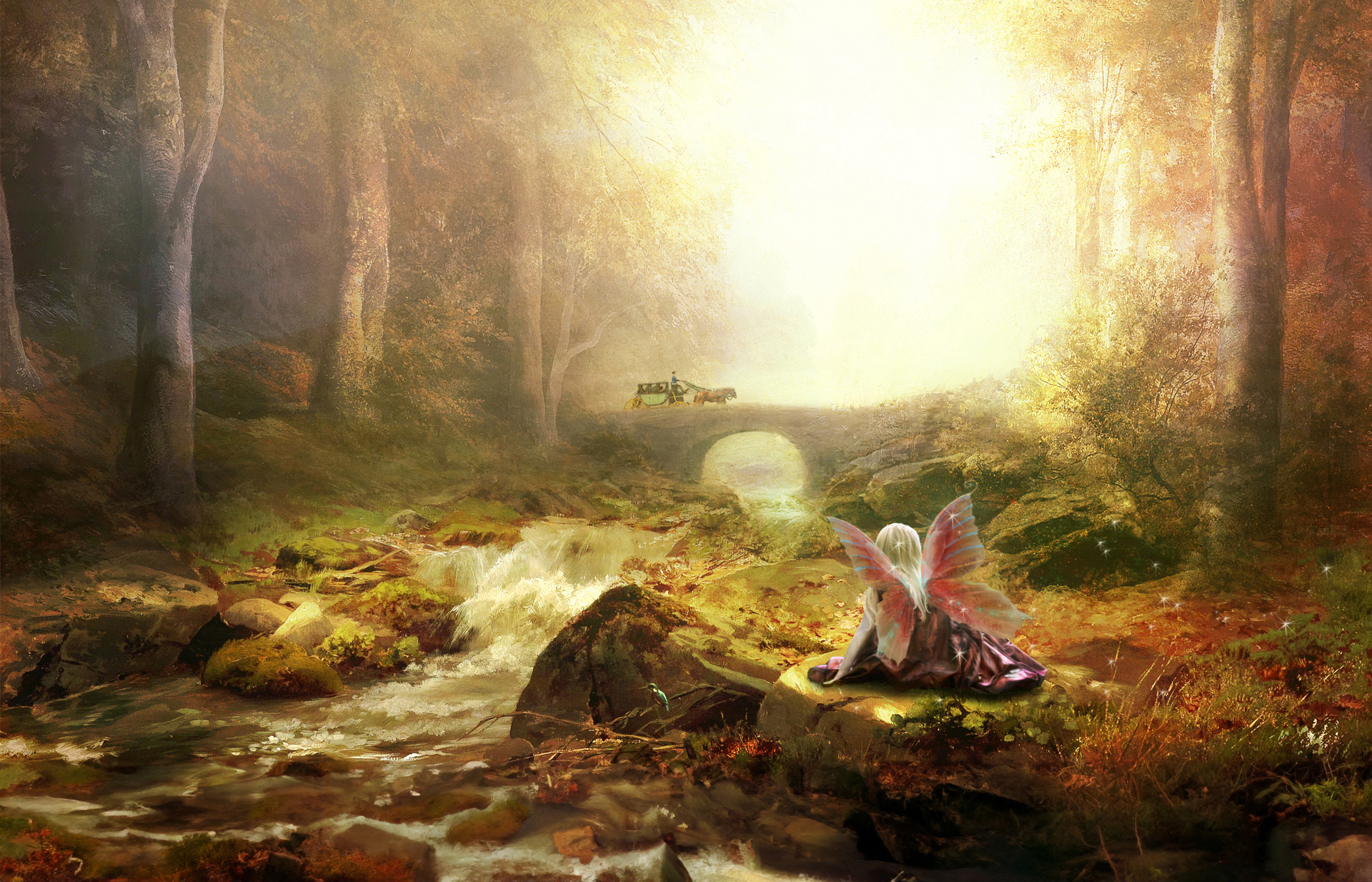 I created this Fairy Watching a Carriage Go By digital art layout in 2014 using a premade digital background painting by Lorie Davision, a carriage photo, a girl photo, and wings. You can see the original process in this blog post here, which will also include the photos I used for the composite. I had signed up for the Photoshop Beta, which is Photoshop but with A.I. and decided to make a small change to it.