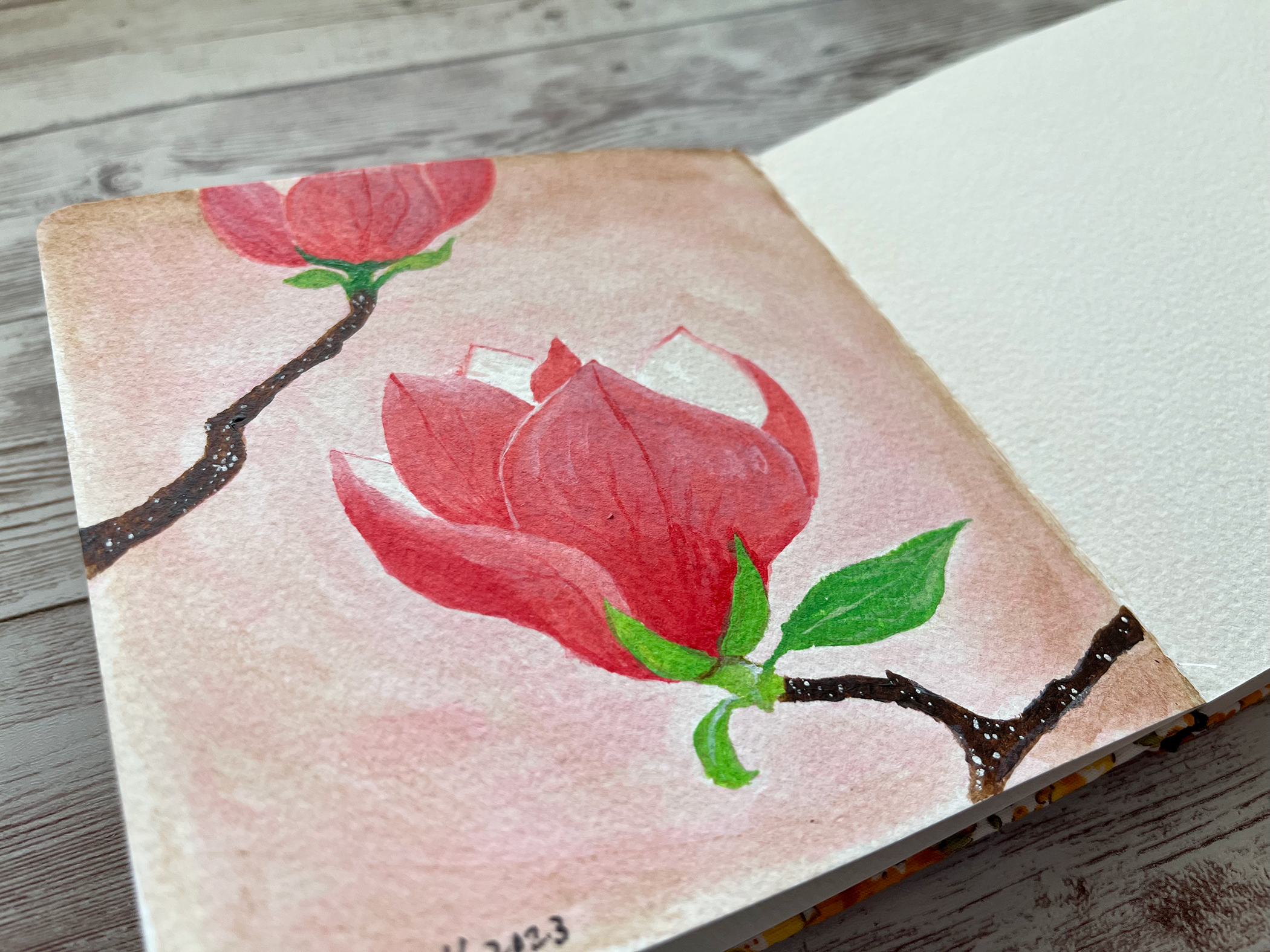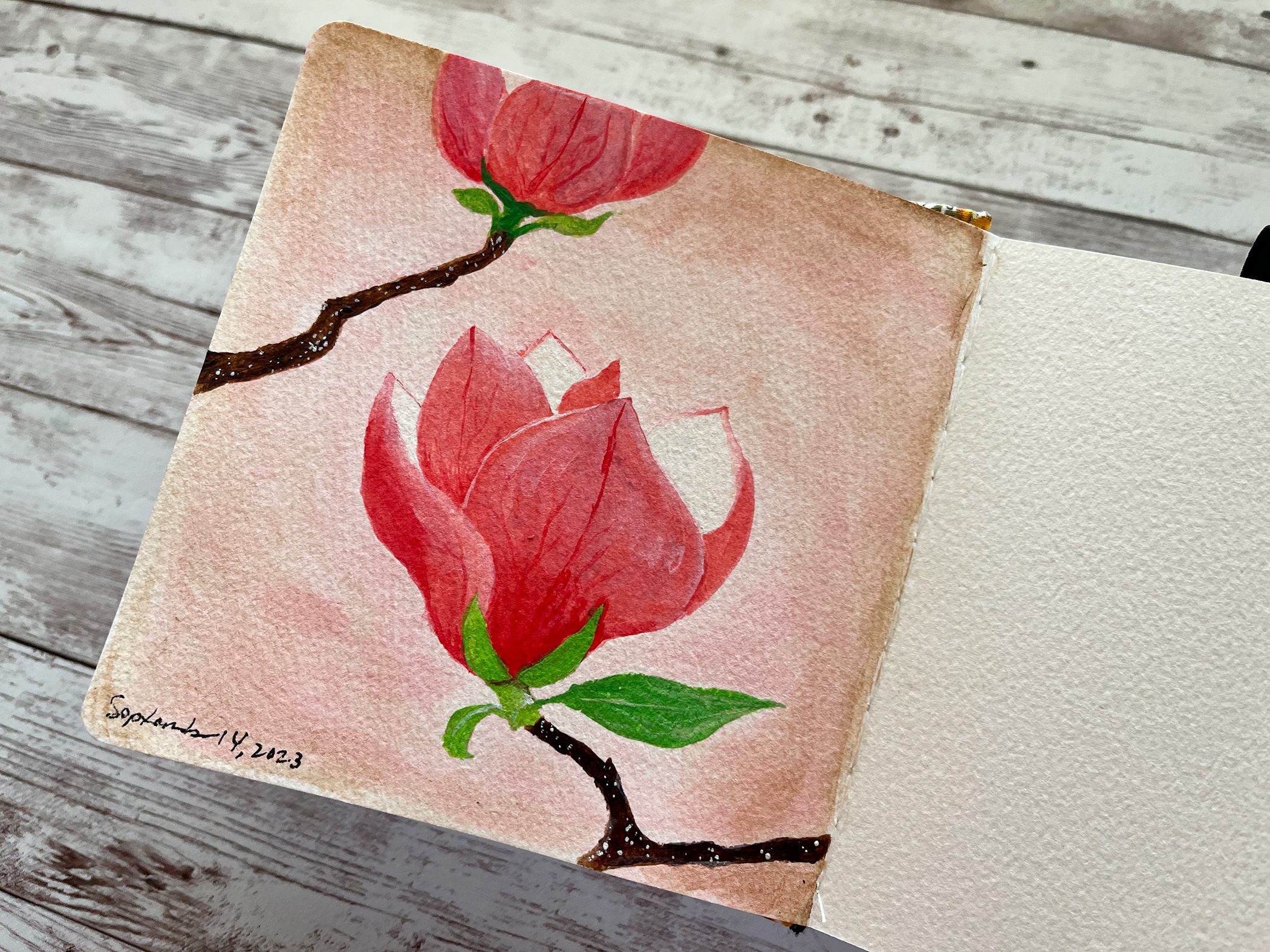 I rarely paint in acrylic anymore (I mainly use acrylic for mixed media…like this) but decided to try my hands at it with this magnolia. After painting in gouache for some time now, I was surprised to find that acrylic felt like gouache. I thought gouache would feel more like watercolor, but I’m beginning to think it’s not so.