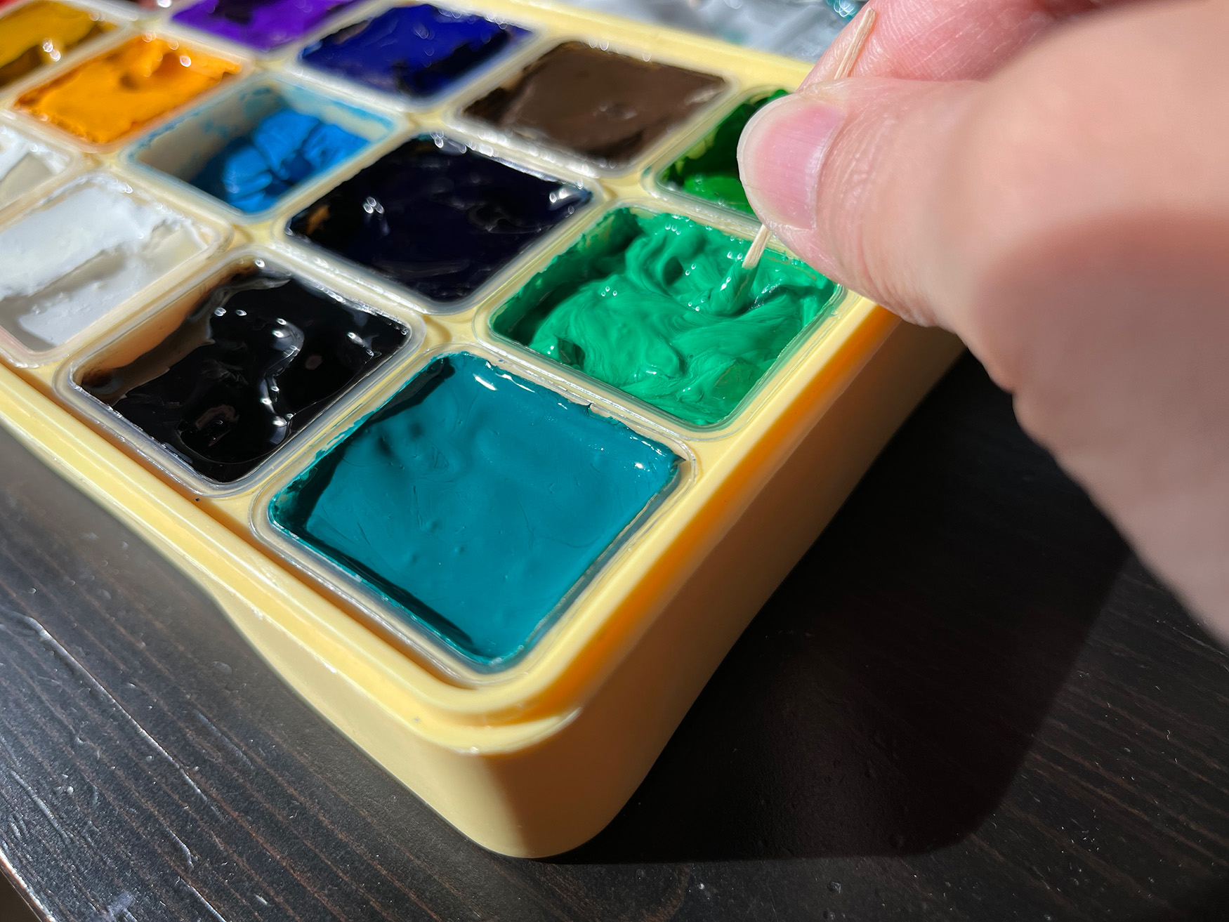 Here, I’m mixing the gel gouache. Sometimes the surface carries a clear or yellowish liquid do to separation.