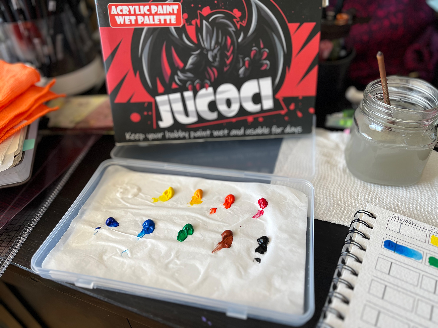 The Holbein is a way better gouache than the student grade W&N, but the W&N isn’t bad. I also bought a wet palette to play with. Gouache dries quickly and it’s easily reactivated with water, but the fun is in using it in its gel state.