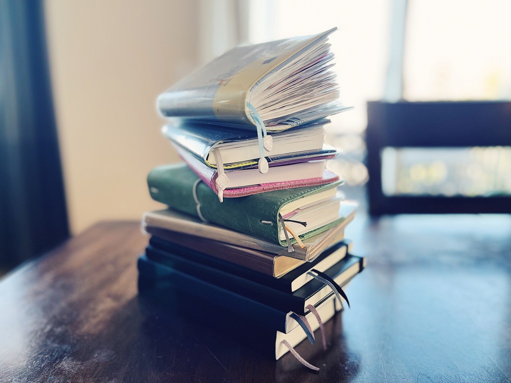 Notebooks. I’ve got tons of notebooks (including traveler’s notebooks, junk journals, art journals, and planners) and I keep buying more. It’s like I’m trying to find the perfect notebook even though I probably have the perfect notebook in my stash. The photo only shows 10 of my, possibly, 100 notebooks.