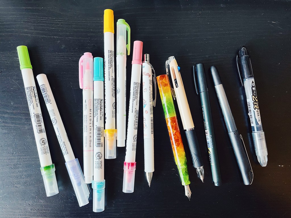 Writing utensils. Currently, the orange and green fountain is my go-to for journaling. I’ve got other fountain pens too, but this one writes the smoothest and I love the sound the tip makes as it glides over paper. I use a lot of markers and highlighters in my planners. Afters years of trying a few different brands, I’ve come to love Mildliners and Tombow markers. For brush lettering, my go-to is the Pilot dual brush pens in gray and black. I’ve also been using the Kuretake Fudgegokochi in gray and just love how it makes my writing look like watercolor.