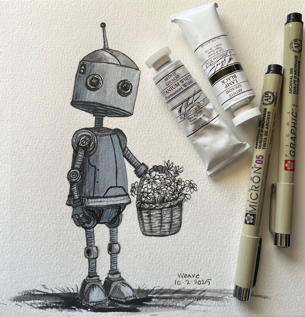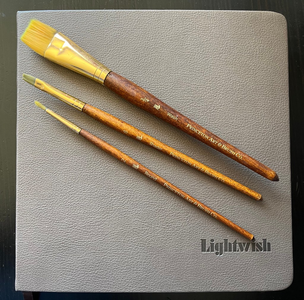 The art supplies I’ll be using will be limited to a few items. My goal is to use black and white gouache (with a limited usage of more colorful gouaches), Micron pens, and a pencil to do pre-sketching. I’ll be using this 7.48″x7.48″ Lightwish watercolor journal and these Princeton brushes.