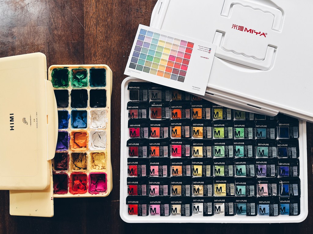 In the photo above, you can see that I haven’t opened the MIYA gouache set yet. It was a Christmas gift from my daughter. I’m almost too scared to open the cups because I know they’ll dry out before I could get through all the colors. I could just open the ones I plan to use, but eventually, I’ll have to open them all. Once dried, they’ll look like the HIMI cups on the left. They’re still usable, but they’re so much more fun to use when they’re jelly-like.