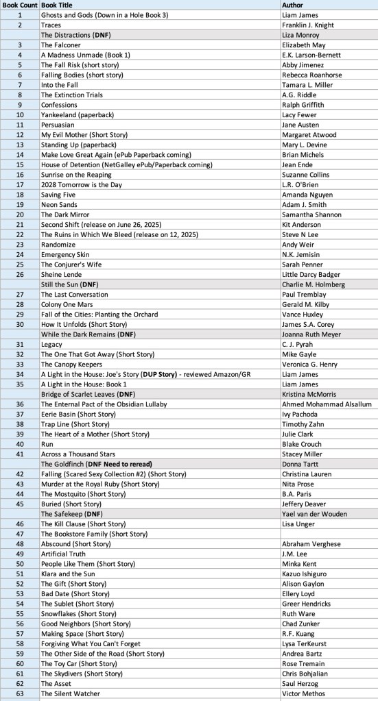 Here’s the spreadsheet where I tracked all the books stats for my personal tracking. There’s a lot more information on this spreadsheet, but this is only to show the total number of books read and books I didn’t finish (DNF).