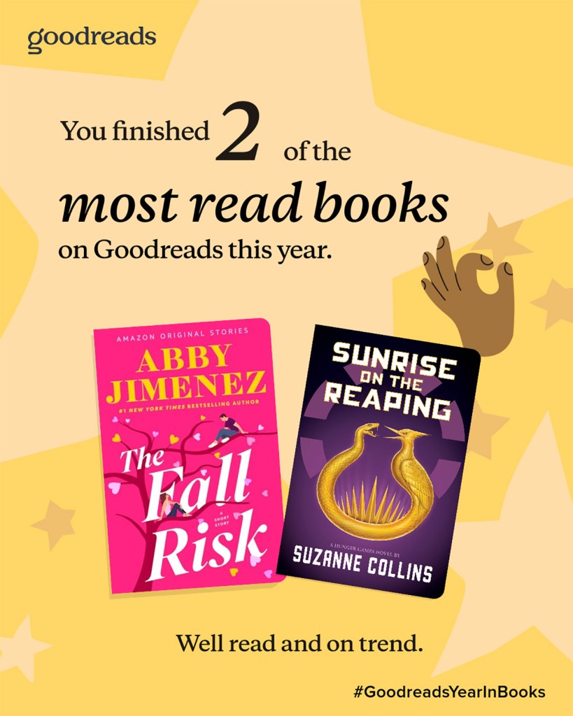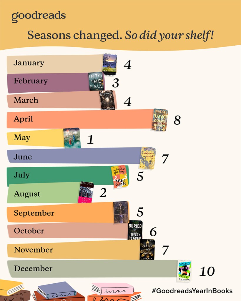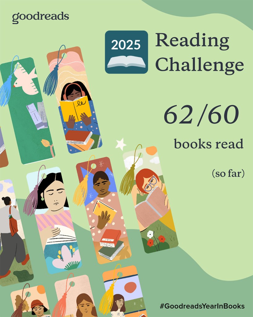This year, my reading goal was 60 books. I surpassed that with 63 books (although, Goodreads only tracked up to 62 books because the 63rd book didn’t make it into their database in time for the end-of-year count).