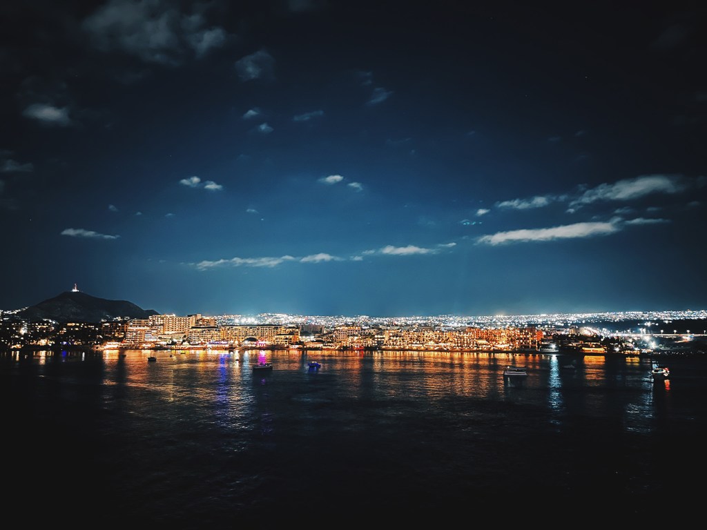 Sunset on the ship facing Cabo San Lucas. It was an overnight stay. Day one there, we took a tour around town. On the second day, we walked the shopping strip and ate at a restaurant.